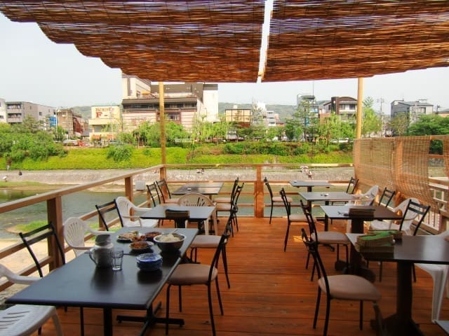 | 下木屋町區 | 鴨川テラス | 河景露台餐廳,供應西式與日式餐點及咖啡 | 鮭魚飯、法式起司漢堡、河畔咖啡 |