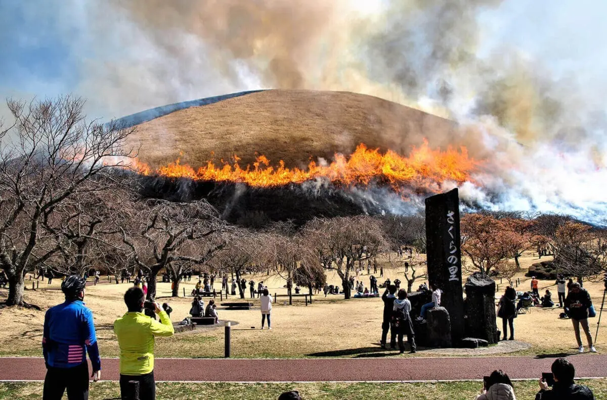 這座火山每年都會進行高山燃燒,這是一個持續了700多年的傳統活動。燃燒結束後,大室山的山頂被一年生植物所覆蓋,呈現出綠意盎然的景觀。正因如此,大室山也成為了伊東市的象徵之一。