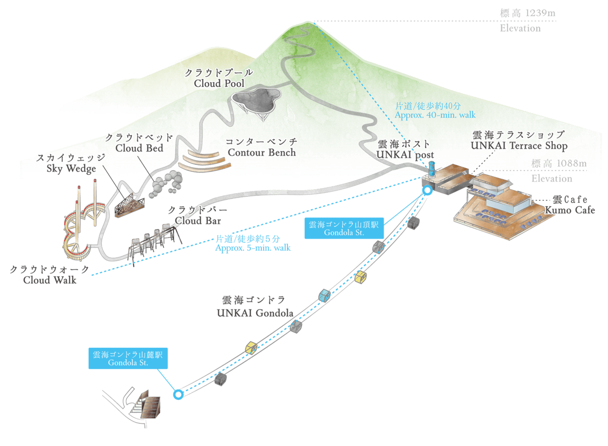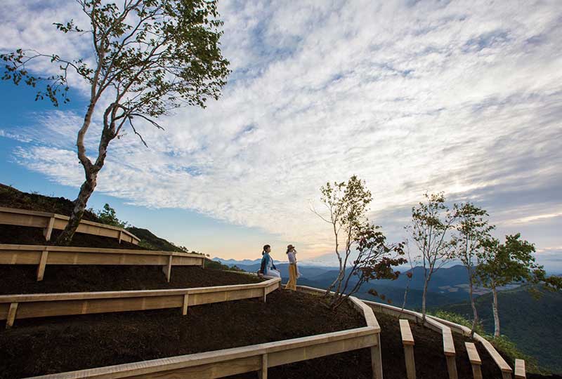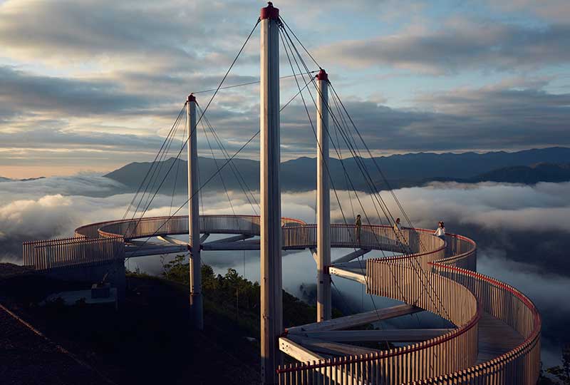雲朵形狀的遊步道。遊客可以在此體會到彷彿在雲上行走的夢幻感受。由地面向上延伸的展望台,可以不受山脈的影響,觀賞到近210度的雄偉景色。