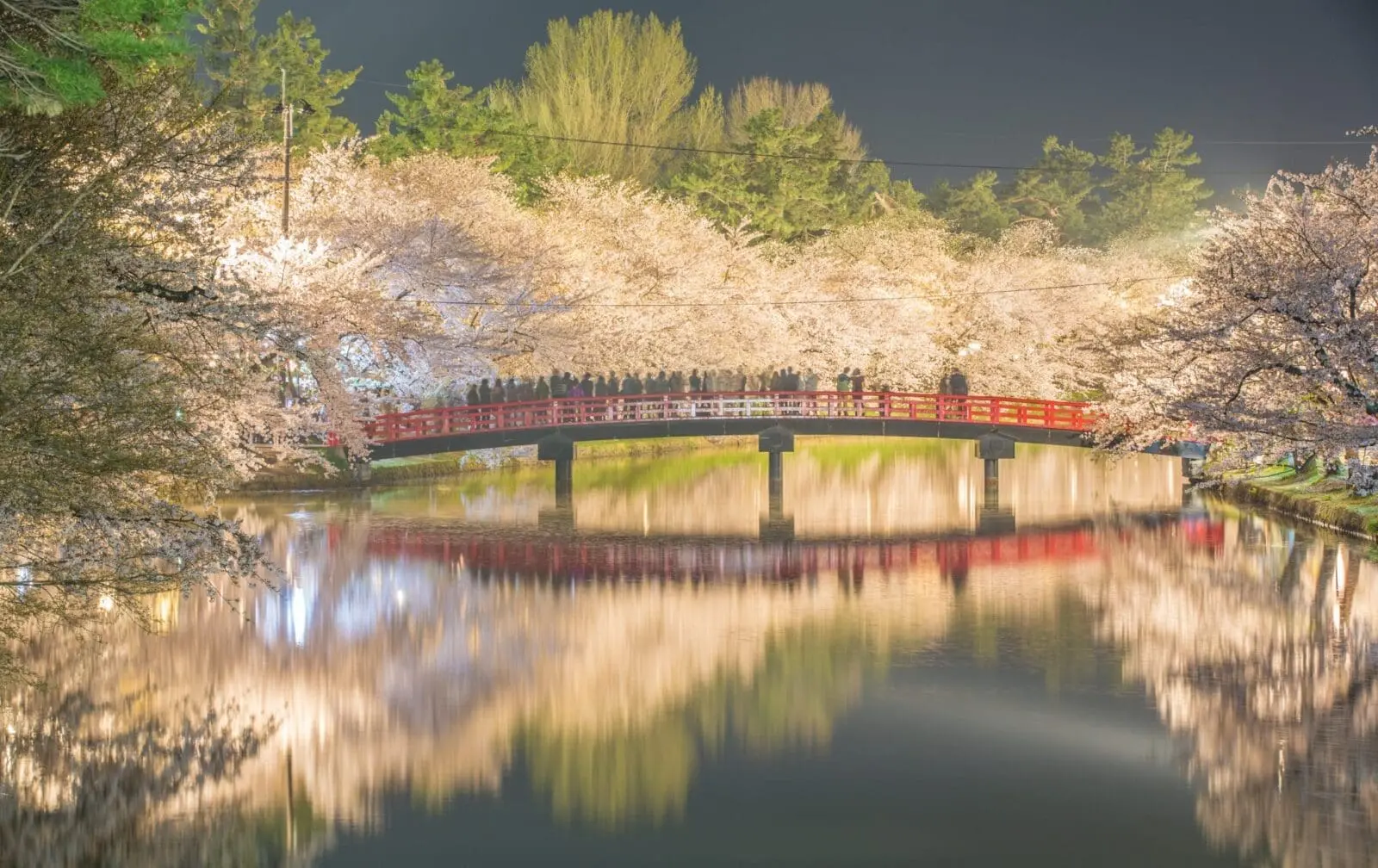 - 夜晚點亮的燈光營造出如夢似幻的景象,櫻花樹倒映在護城河中,非常壯觀。
