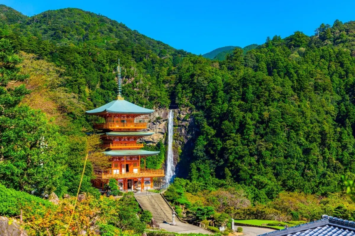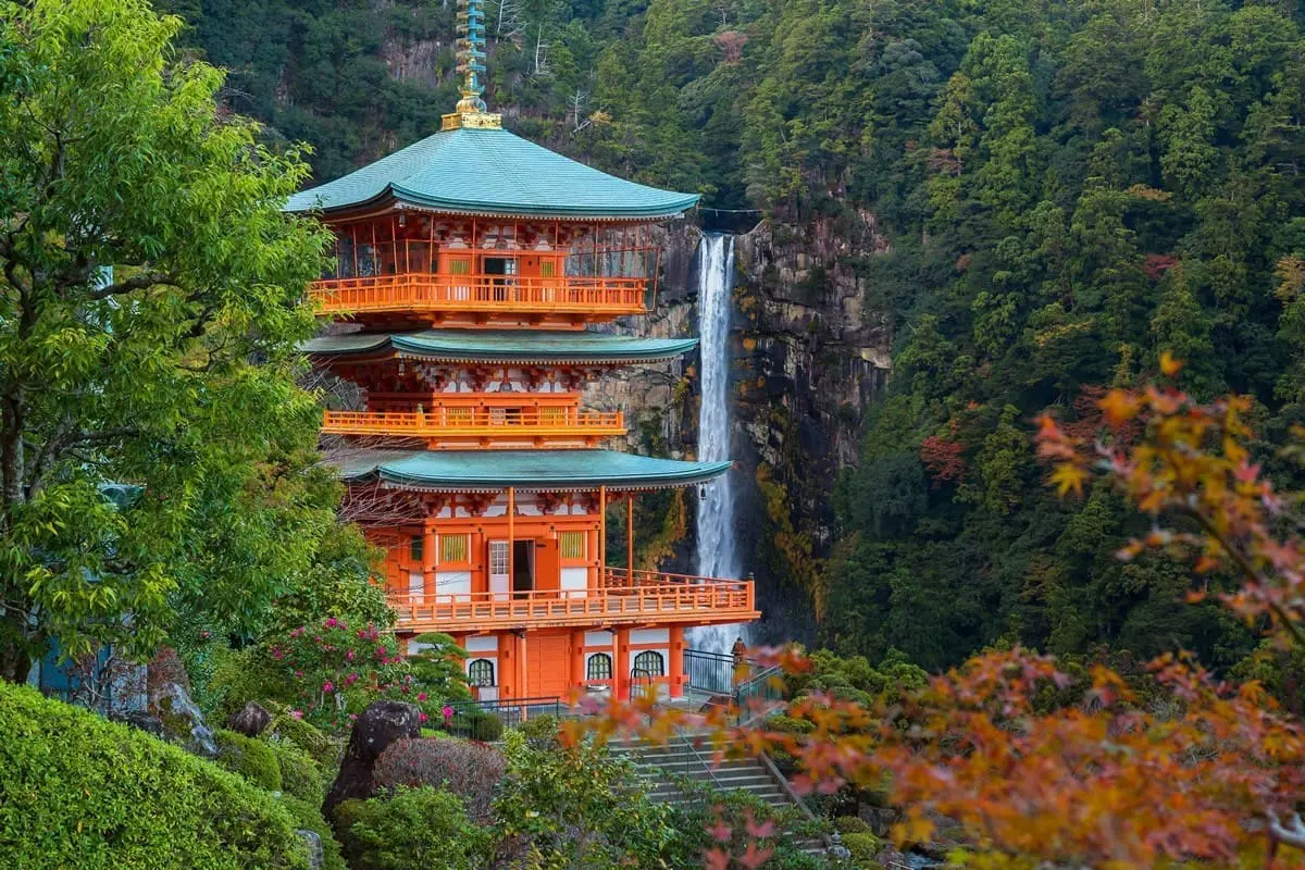 那智大瀑布以133公尺落差與每秒超過1公噸的水量成為日本最高的單一瀑布,被譽為「靈山那智」的核心。瀑布旁的熊野那智大社與朱紅色的三重塔構成最具代表性的攝影畫面,是融合自然與信仰的聖地。