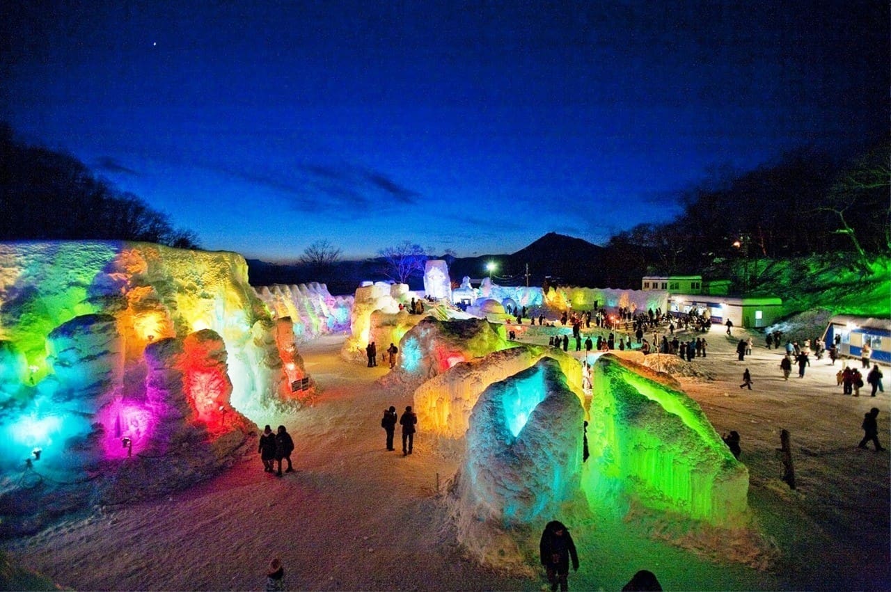 支笏湖是日本著名的淡水湖之一,其清澈的湖水與周圍壯麗的自然風光使其成為一年四季都吸引遊客的熱門景點。而到了冬季,這裡便成為了一個宛如童話世界般的夢幻之地。支笏湖水濤祭利用湖水,經過噴射冷卻後形成各種固態造型,最常見的是噴泉狀的冰雕。這些冰雕在白天展示著冰雪的晶瑩剔透,而當夜幕降臨,燈光一一點亮,整個湖畔瞬間變成了夢幻的光影世界。冰雕被五彩斑斕的燈光映照,彷彿進入了一個冰雪王國。