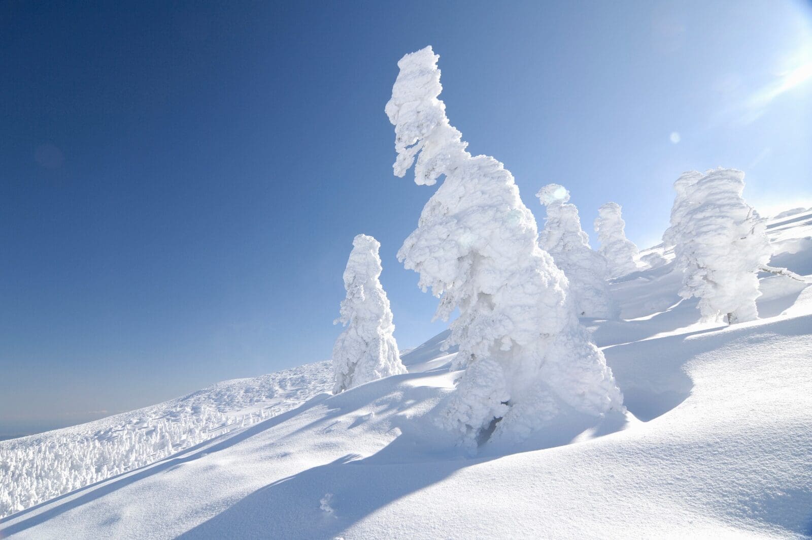 藏王山不僅是一個著名的滑雪勝地,還以其壯觀的樹冰景象吸引了無數的遊客。所謂「樹冰」,是由西伯利亞吹來的強勁西北季風,將帶有水汽的空氣凍結在樹木上形成的冰雪奇景。這些冰雪層層疊疊地覆蓋在針葉樹上,形成了一個個形狀各異的巨大冰塊,猶如一隻隻沉睡的雪怪,因此也被稱為「雪怪」。樹冰最壯觀的時期在2月,那時的樹冰已經完全形成,體積龐大且造型奇特,讓人不禁驚嘆大自然的鬼斧神工。
