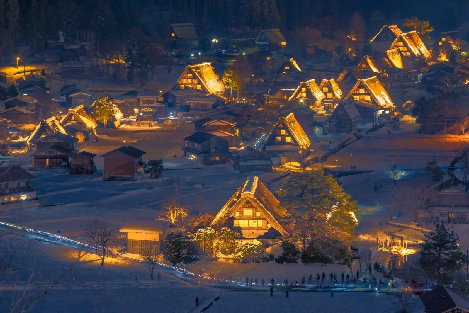 而在冬季,白川鄉則會舉行一年一度的「點燈節」。這是白川鄉冬季最盛大的活動,也是日本冬季最著名的景觀之一。當大雪覆蓋村莊,整個村落變成了一片雪白的世界,而到了夜晚,所有的合掌造房屋和街邊的路燈一一點亮,燈光映照下的村莊宛如童話中的場景,彷彿置身於一個巨大的聖誕雪花玻璃球中。