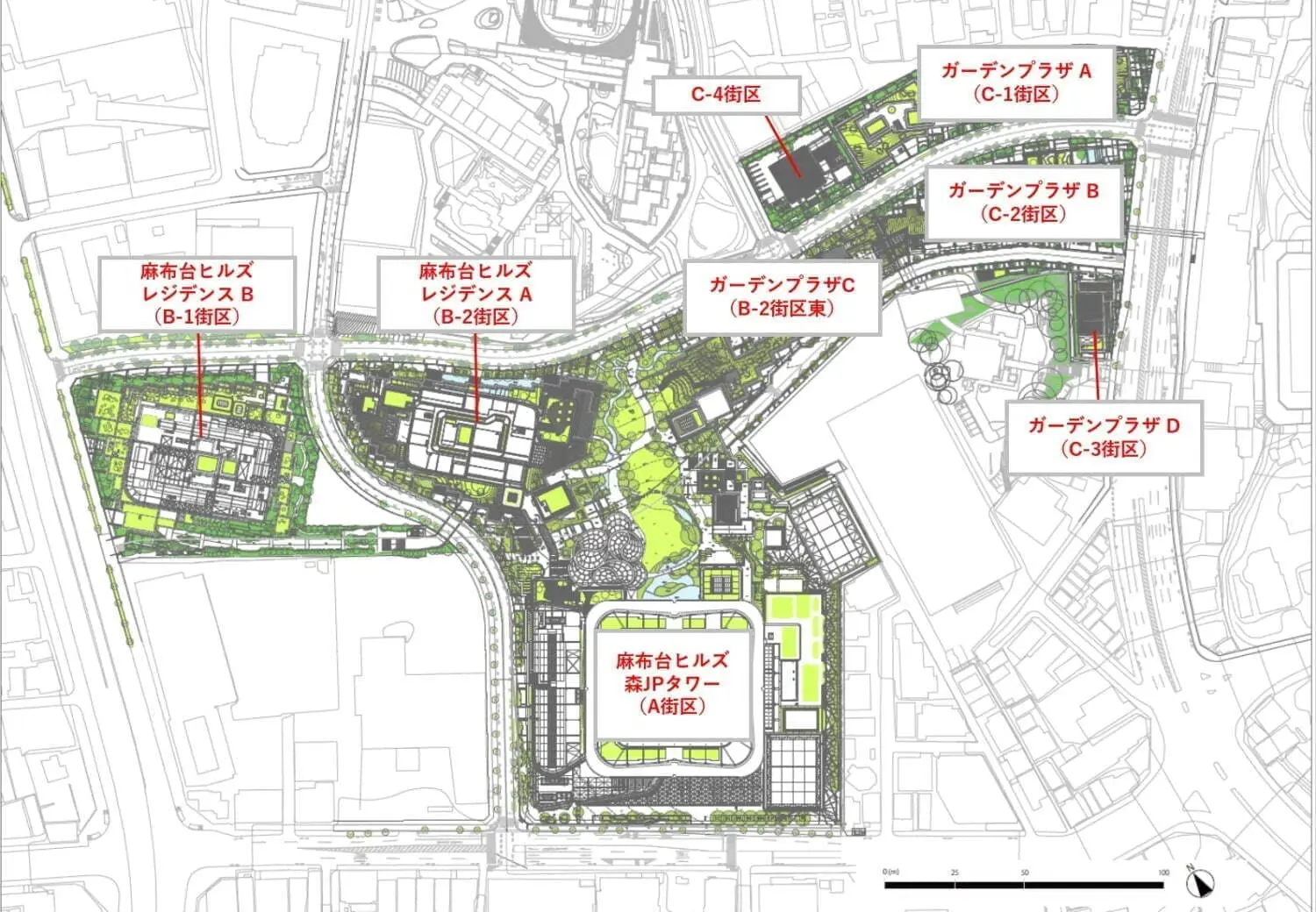 來到麻布台hills,你會發現這裡有三棟高樓和四棟低樓。高樓部分包括了「森JP塔」、「Residence A」和「Residence B」;低樓部分則是「花園廣場」A~D。