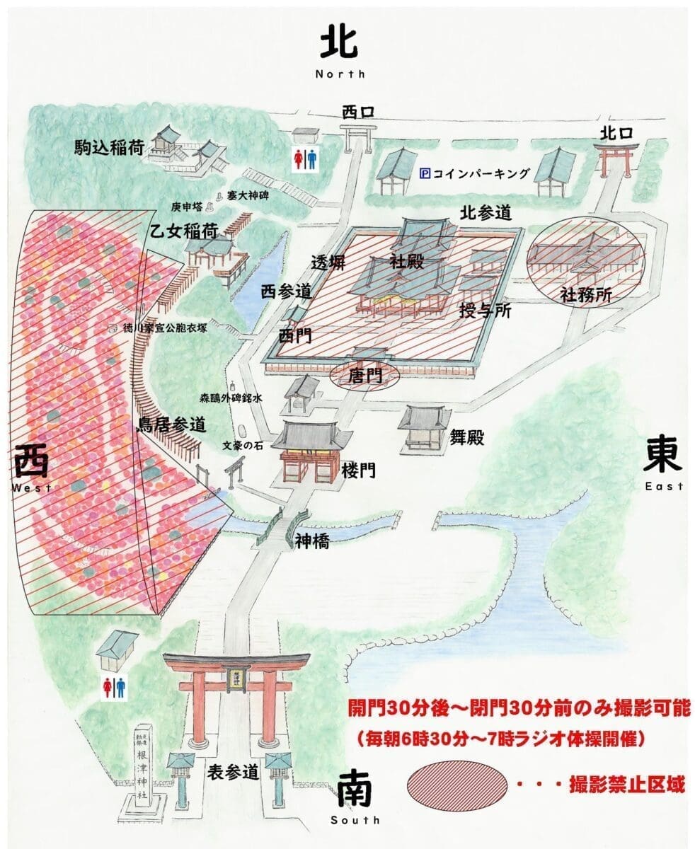 花園非常小巧美麗,而且入場不限時,所以在下午5點前沒有夜場。其他注意事項包括禁止攜帶飲食品、禁止使用腳架或三腳架進行拍攝、進入花園要支付觀賞費、不得再次進入等等。除了觀賞杜鵑花外,根津神社的杜鵑花祭還包括多個諸行事,如神輿渡御、伝統工芸展示会、根津権現太鼓、食品衛生街頭相談、骨董市、露店等,非常值得一去。