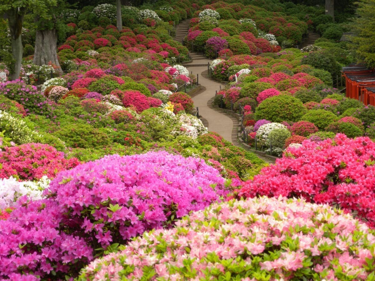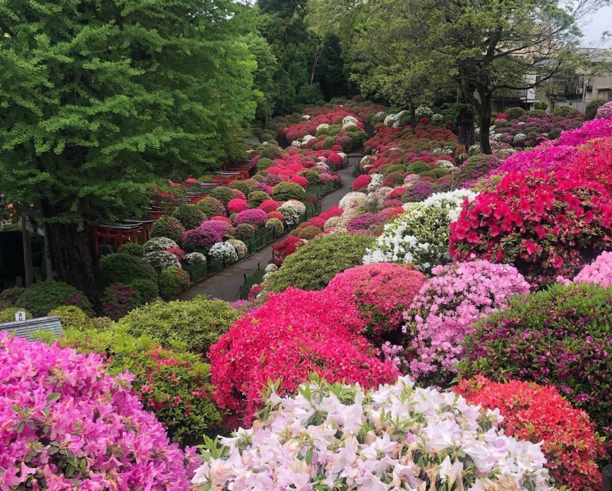 東京文京區根津神社的杜鵑花祭是一年一度的盛大活動。在根津神社的2000平方米杜鵑花園中,約有100種3000株的杜鵑花盛開著,從四月中旬到下旬都是最佳賞花期,而觀賞費用為300日元,可以一次進入,並且在1至2個小時內遊覽。