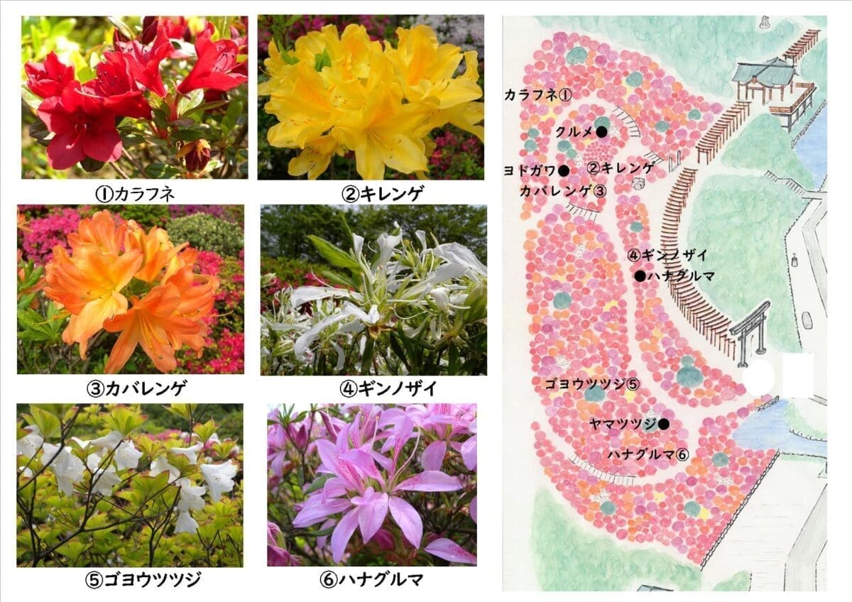 約有100種3000株的杜鵑花在此競相盛放,盛花期在4月中旬至下旬(由於每年氣候不同,盛花期會有所差異)。因為種類非常多且開花時期不同,所以從早花到晚花會有不同的花朵盛開,可以長時間欣賞各種杜鵑花。在其中還能看到豆子大小的富士杜鵑、風車般的花瓣花的花織、以及被稱為黑杜鵑的火焰花等珍奇的花卉。