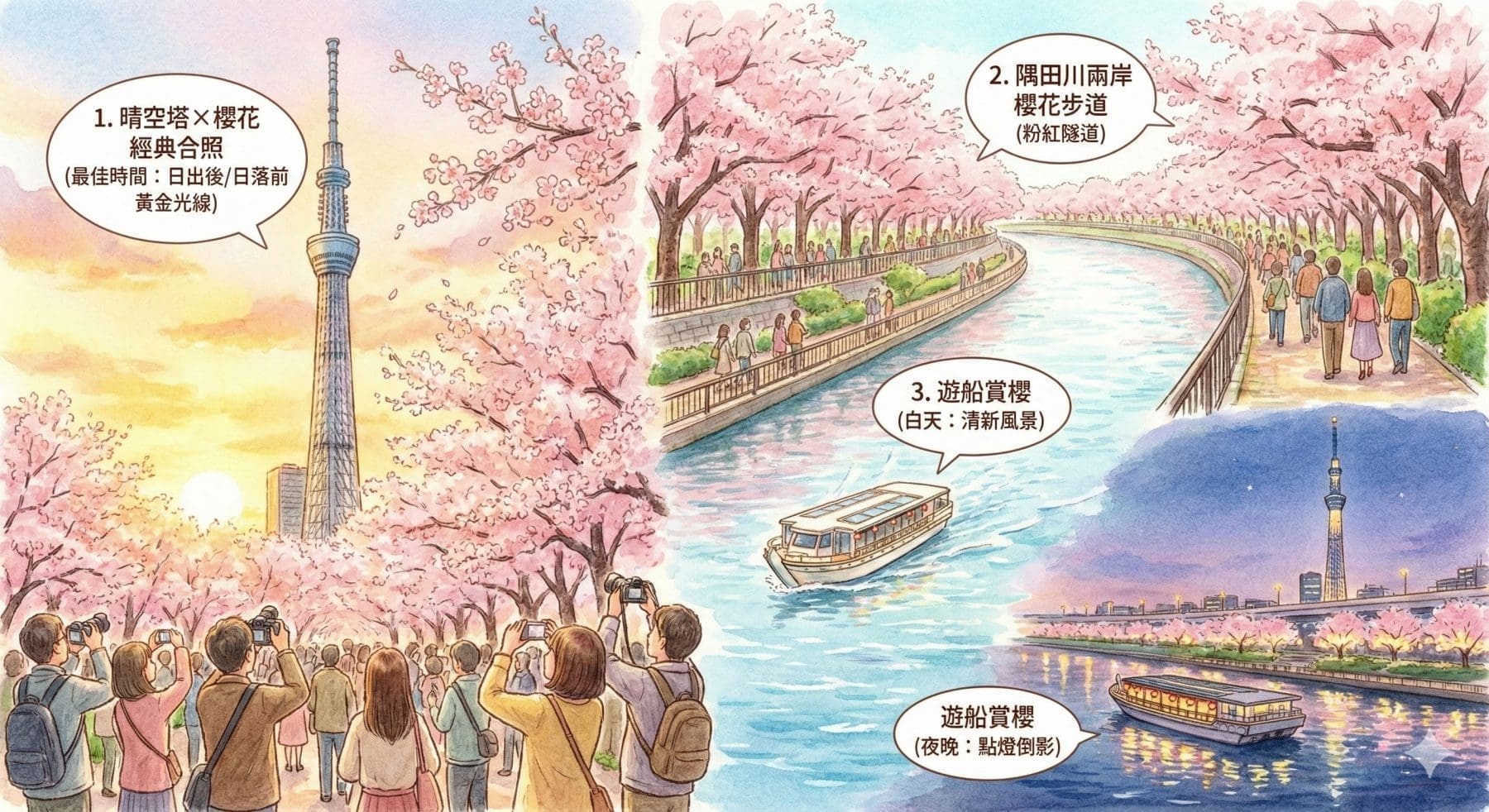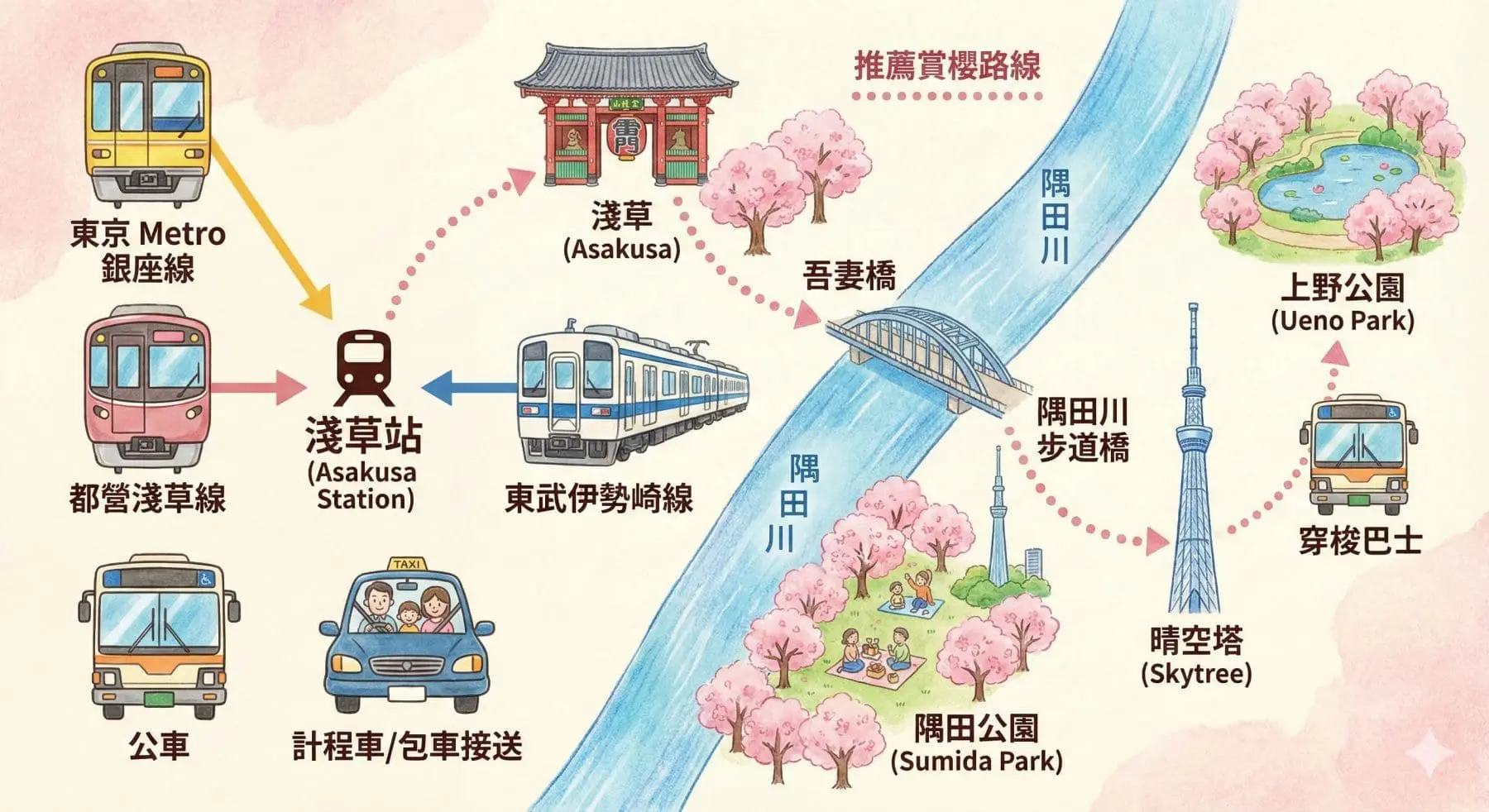 我會依你的動線安排「淺草 → 隅田公園 → 晴空塔 → 上野公園」一條龍櫻花路線,不用轉車、不用人擠人。
