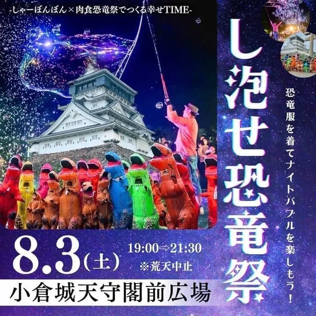 8月3日(日)し泡せ恐竜祭北九州市 小倉城廣場恐龍模型、互動遊戲、燈光秀