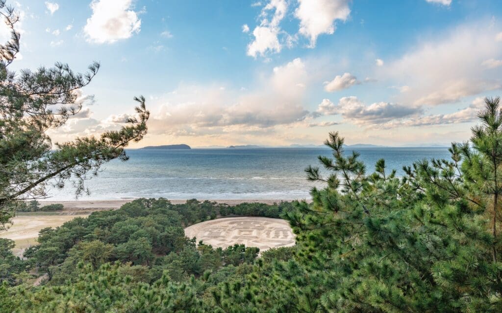 香川琴壇公園內的寬永通寶砂繪,是一個令人驚嘆的景點,描繪了江戶時代硬幣的力量。它坐落在瀨戶內海的海岸線,周圍有48公頃的黑松林。