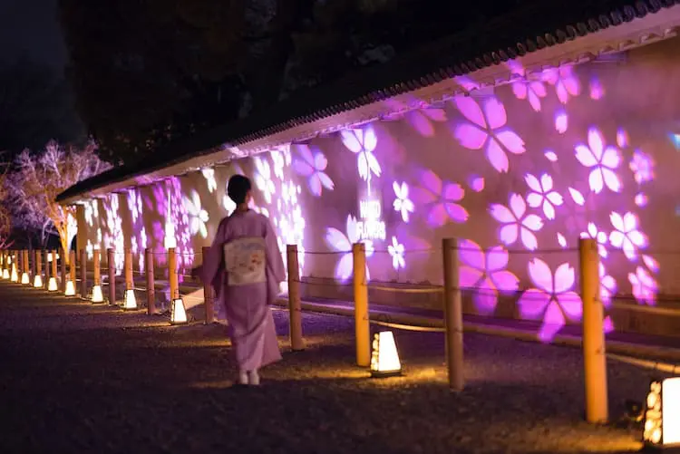 而在夜晚,二條城將變成一個神秘而浪漫的地方。歷史空間的全息投影和櫻花燈光照明將城堡裝點得如夢似幻。這些視覺盛宴為訪問二條城的遊客帶來了一場獨特的夜晚體驗,將春天的美麗與歷史的韻味相結合,令人難以忘懷。