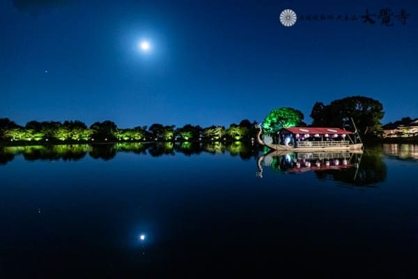 「觀月的夜晚」起源於嵯峨天皇,他在中秋之夜於大澤池泛舟,與文化人和貴族共賞明月。如今,這一傳統延續了下來,每年的9月15日至9月17日,您可以在大澤池欣賞到天上和水中映射的兩個明月,這一獨特景象讓人流連忘返。