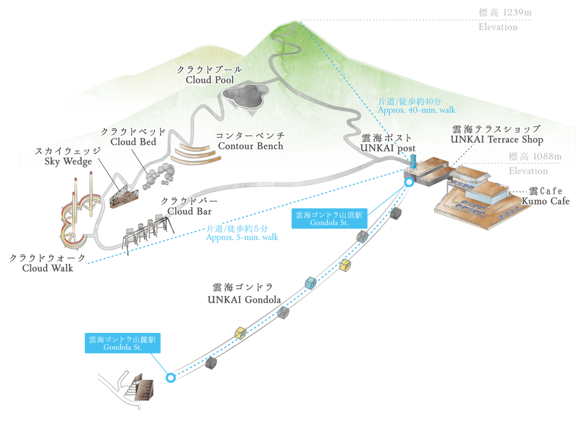 雲朵形狀的遊步道。遊客可以在此體會到彷彿在雲上行走的夢幻感受。由地面向上延伸的展望台,可以不受山脈的影響,觀賞到近210度的雄偉景色。