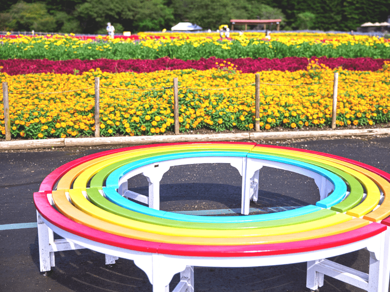 每年秋季,本栖湖渡假村會舉辦「彩虹花祭」,將超過90,000株、15種不同花卉依照紅、橙、黃、綠、藍、紫的彩虹色排列,打造一整片宛如魔法地毯的夢幻花海。而這片花田的背景,正是壯麗無比的夏日富士山,沒有雪的富士山,更顯原始雄偉。