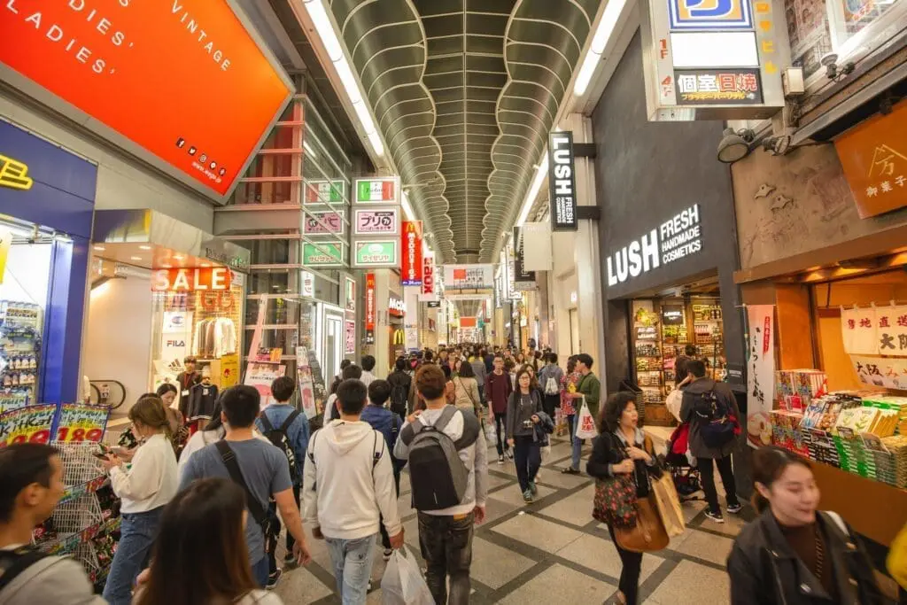 心齋橋筋是一條在御堂筋東側,與之並行的南北向大道。北自順慶町大通南至道頓堀川上的戎橋,是大阪最大的商店街。此地除了SOGO、大丸百貨、SONY TOWER以外,還有一些老店,以及喜好逛街和熱鬧的人潮,十分熱鬧。位於南海難波車站的“難波城”是交通極爲便利的購物區,這裏集中了精品店、餐飲店等近 300 家店鋪,其中還有一出站就可以看到著名的桃山建築式新歌舞伎座。另外,地鐵難波車站周圍分佈著許多專門提供大阪平民菜肴的餐館。道頓堀,整條的美食街。