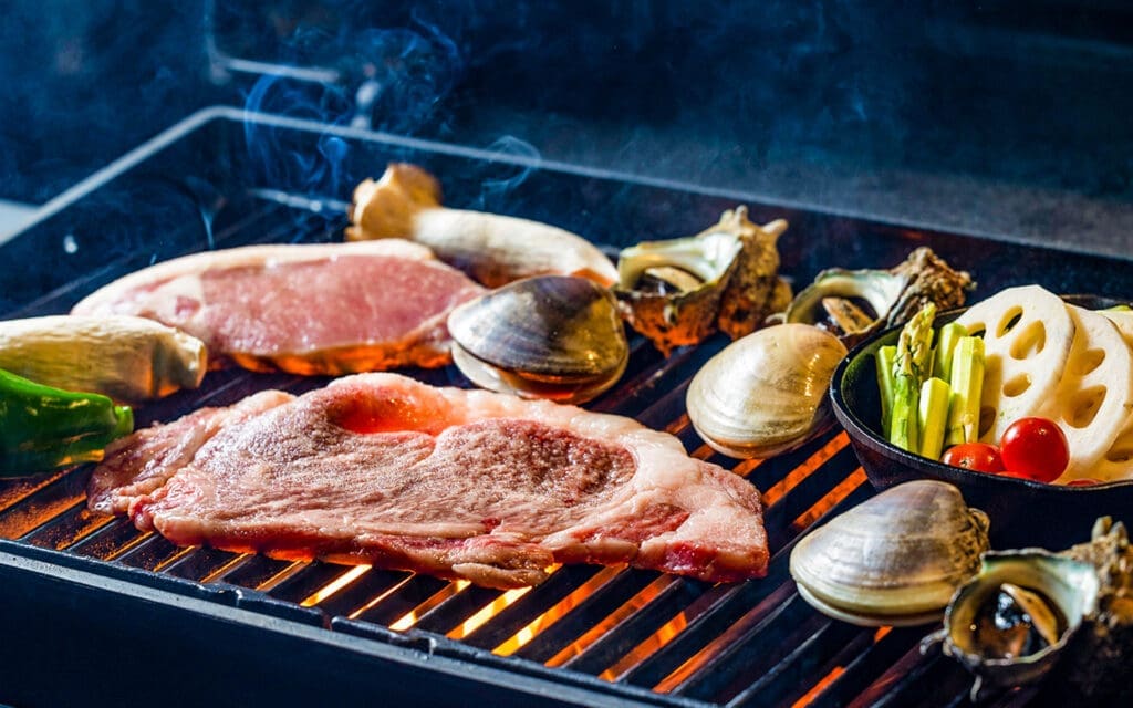 常陸牛沙朗牛排 茨城玫瑰豬肉 茨城蛤蜊 土浦特產蓮藕烤蔬菜 使用天然酵母製作的法式長棍麵包 茨城馬鈴薯