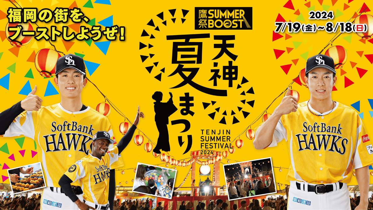 鷹祭 SUMMER BOOST meets 天神夏祭7月19日(金)~8月18日(日)全天福岡市役所西側ふれあい廣場無需門票豐富多彩的娛樂節目和攤位活動。
