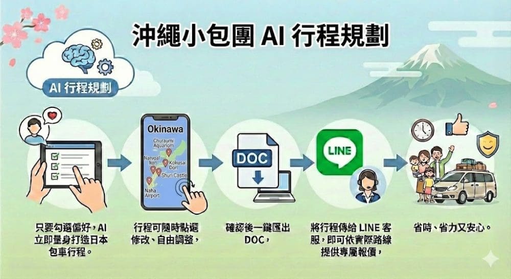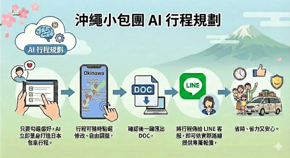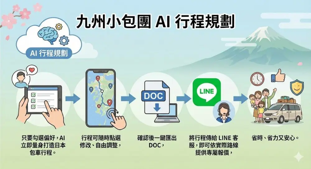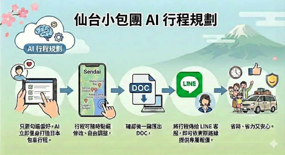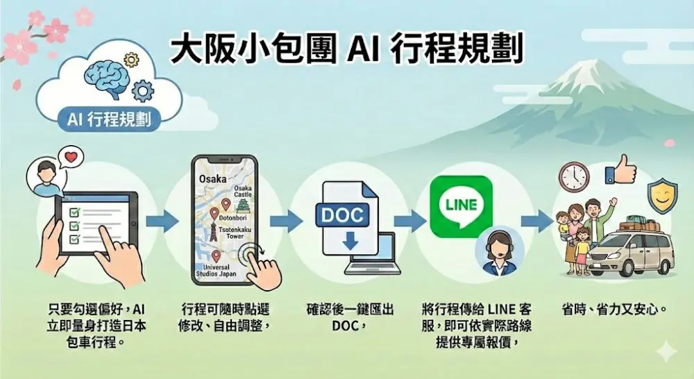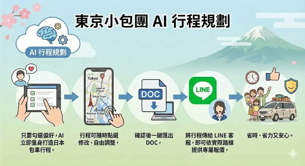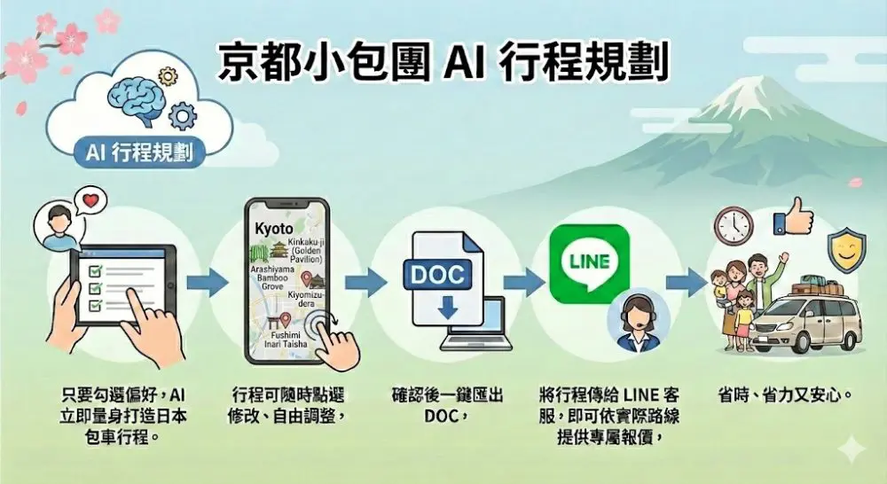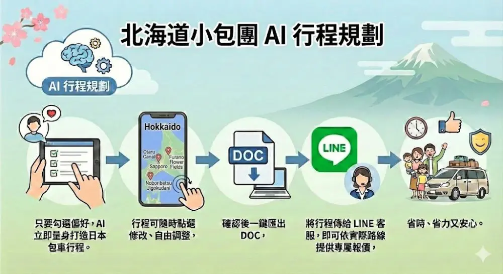只要勾選偏好,AI 立即為您量身打造日本包車行程。行程可隨時點選修改、自由調整,確認後一鍵匯出 DOC,將行程傳給 LINE 客服,即可依實際路線提供專屬報價,省時、省力又安心。