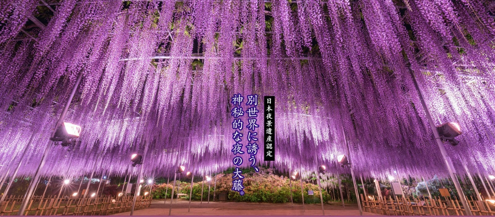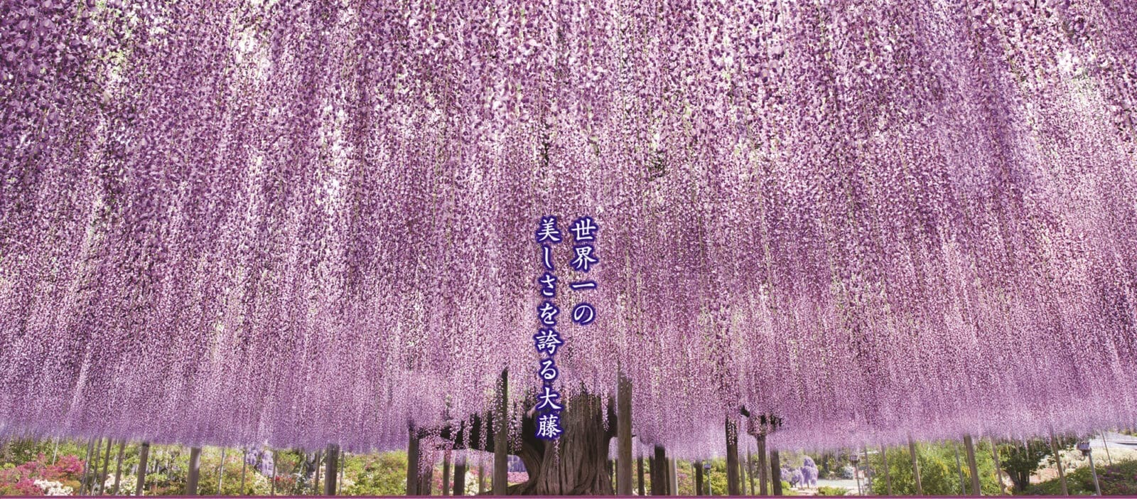 足利市紫藤花園位於栃木縣,是日本最著名的花園之一,尤其以其壯觀的紫藤花而聞名。每年四月底到五月初,花園內的紫藤花盛開,漫天紫色瀑布般的花串垂掛在長長的藤架上,形成一片夢幻的紫色花海。