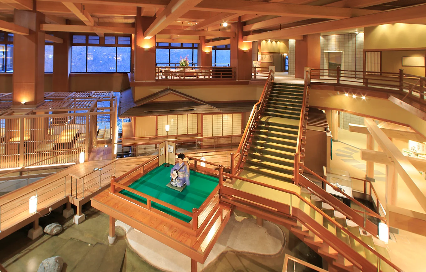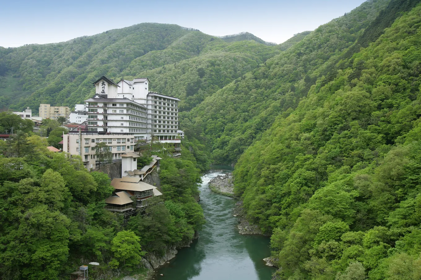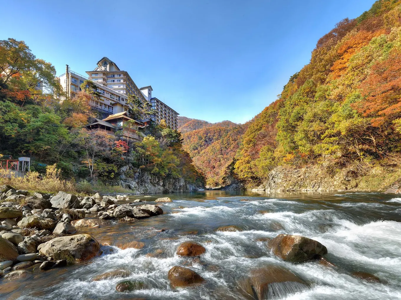 大川莊是會津地區知名溫泉旅宿,以依山傍水的壯麗景致聞名。飯店最大特色是挑高大廳的「浮舞台演奏」,搭配傳統三味線表演,為旅客獻上獨特的文化體驗。溫泉源自天然泉脈,露天風呂可欣賞溪谷四季美景。客房多為和式設計,寬敞雅緻,帶來濃厚日式氛圍。館內料理注重會津地方特色,以時令食材烹調,呈現視覺與味覺兼具的盛宴。