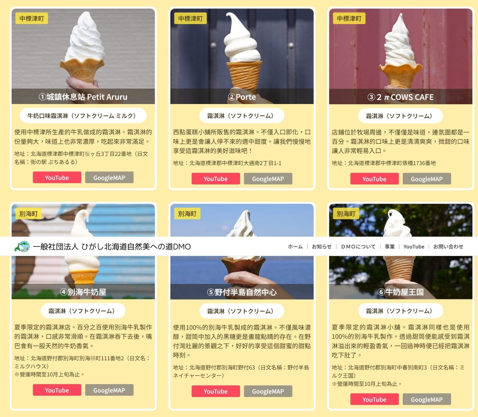 其中一些店鋪包括中標津町的Petit Aruru、Porte,還有別海町的別海牛奶屋等,每一家店鋪的霜淇淋都有自己獨特的風味。有的用的是當地新鮮牛乳,有的則搭配了特色的黑糖甜筒,不管您去哪一家,都能感受到北海道霜淇淋的極致美味。