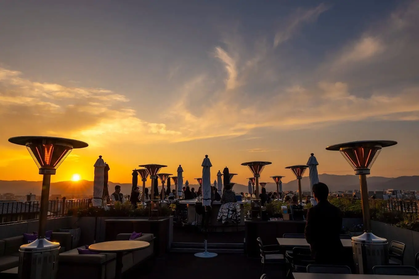 K36 Rooftop Bar 被譽為京都最美的日落觀賞地之一。黃昏時分,坐在酒吧的露臺區,迎著晚風,欣賞夕陽緩緩落下,京都的古老街景與變幻的天色共同構成了夢幻般的場景。