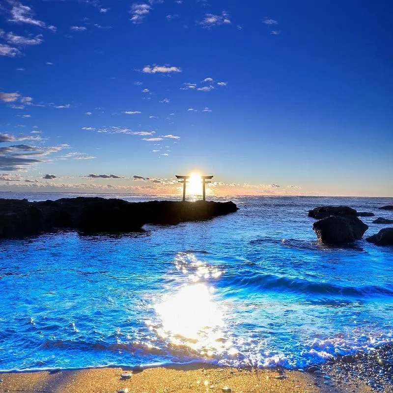 位於茨城海岸,神社最著名的是面朝太平洋、聳立於礁岩上的「神磯鳥居」,晨曦時分尤為壯觀。神社主祀大己貴命,是求平安與航海安全的重要神明。整座神社被海天一色包圍,莊嚴中蘊含自然的力量,是靜心與祈願的絕佳場所。