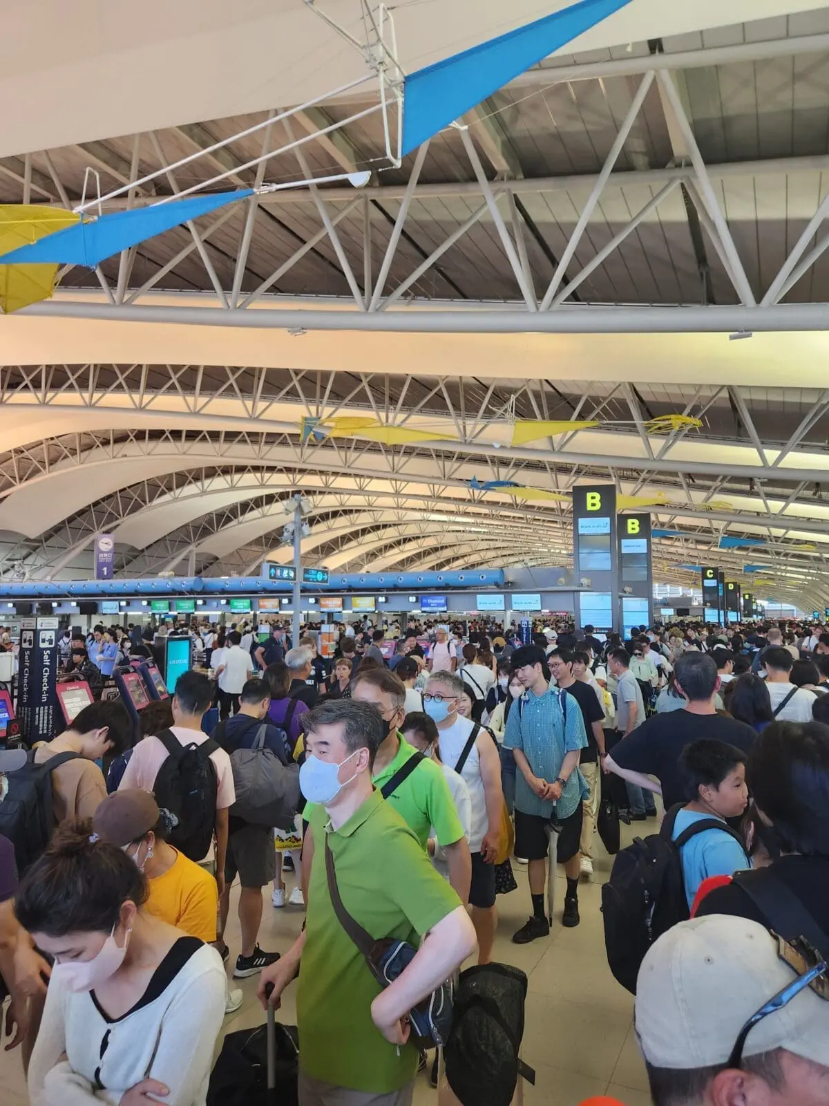 旅客現場直擊發現,許多航空公司櫃檯前排起了長龍,有些隊伍甚至從B行排到D行,隊伍蜿蜒曲折,排隊人潮排了近10排。這樣的情況也讓不少旅客感到焦急,擔心趕不上飛機。