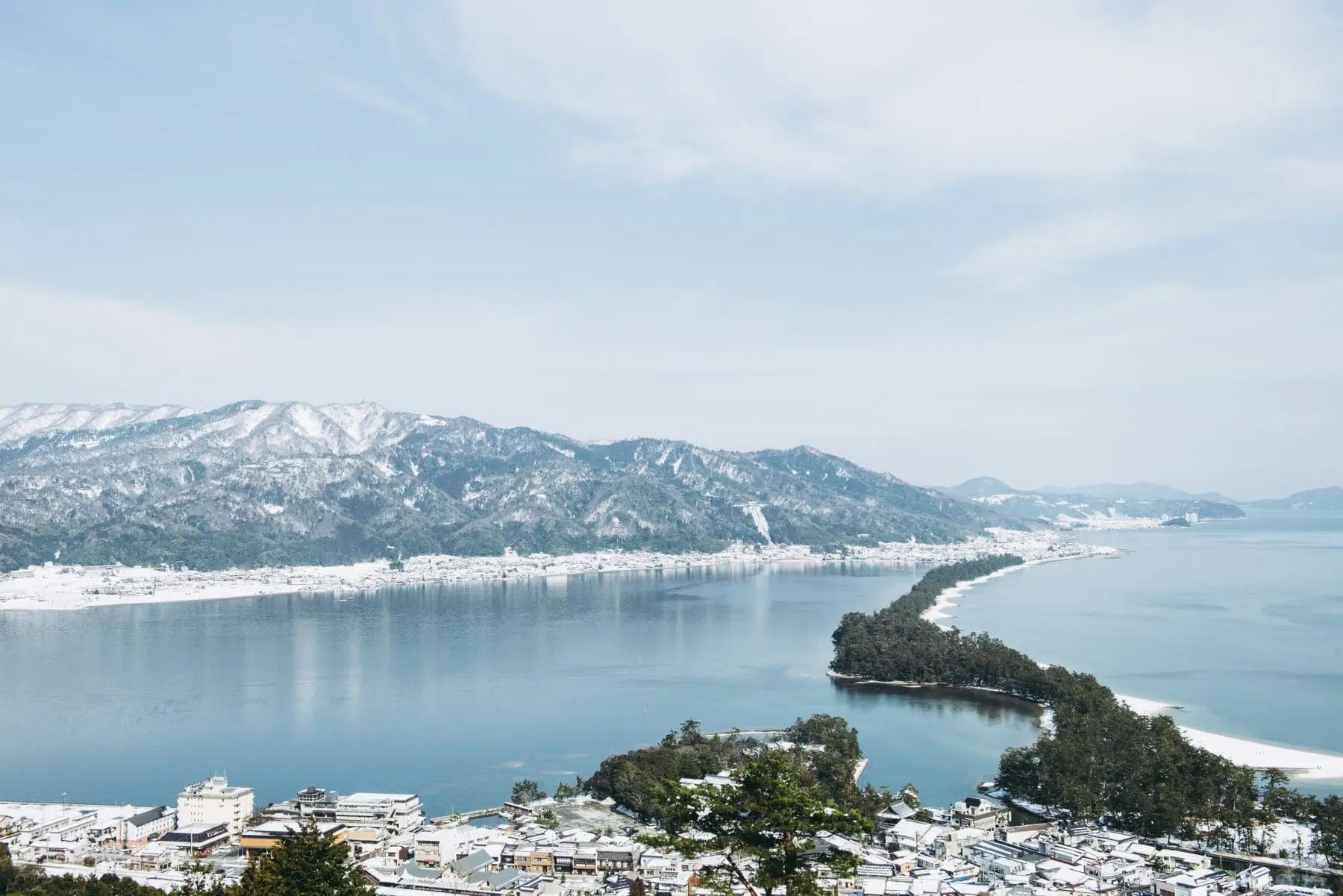 被列為「日本三景」之一的天橋立,冬天時整條沙洲覆上積雪,猶如一條白龍橫臥在海上。