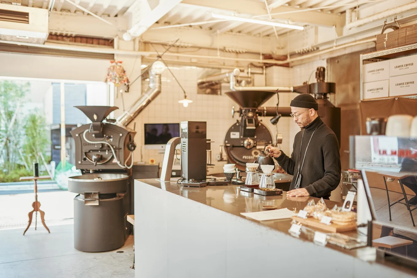 Leaves Coffee Roasters 的服務令人難忘。店員穿著乾淨利落的白袍,動作俐落卻從容,彷彿在進行一場優雅的咖啡實驗。女服務生笑容溫柔,主動介紹咖啡豆特色與建議風味;帥氣的咖啡師專注沖煮,不少旅客形容他像王鶴棣,顏值與專業並存。離店時,他們甚至會站在玻璃窗後微笑道別,這種細膩服務是東京才有的溫暖體驗。
