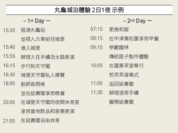 這段兩天一夜的城泊體驗融合了丸龜的歷史、文化與自然之美,讓您在每個細節中感受到古城的獨特魅力。