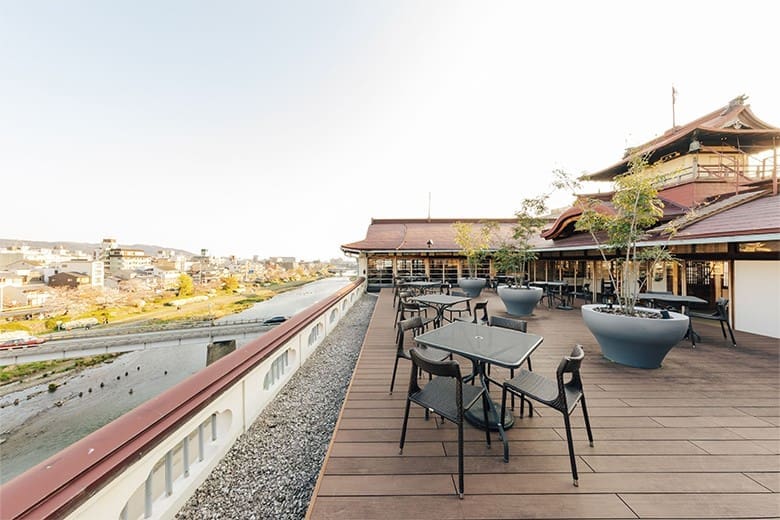 在最上層,鮒鶴京都鴨川リゾート設有一個俯瞰鴨川與東山的露台,這個露台是旅館設計中特別的一環,讓住客能從高處觀賞京都的自然風光。從露台望去,您可以看到象徵京都的清水寺、八坂塔等著名地標,並能欣賞到四季分明的自然風光。春天的櫻花和秋天的紅葉交替,讓這個露台成為京都市區少有的絕佳觀景點。這裡也是攝影愛好者的最愛,可以捕捉到京都最具代表性的景致。