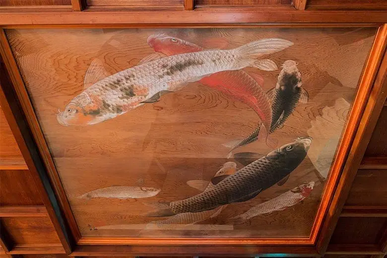 二樓的舊套房「鯉之間」是另一個不容錯過的亮點。這裡原本是旅館的高級客房,天花板上裝飾著精美的鯉魚圖案,象徵吉祥與富貴。這個房間曾接待過多位名人賓客,如今則作為藝術展覽空間開放,您可以在此欣賞到過去的藝術作品與歷史展示。