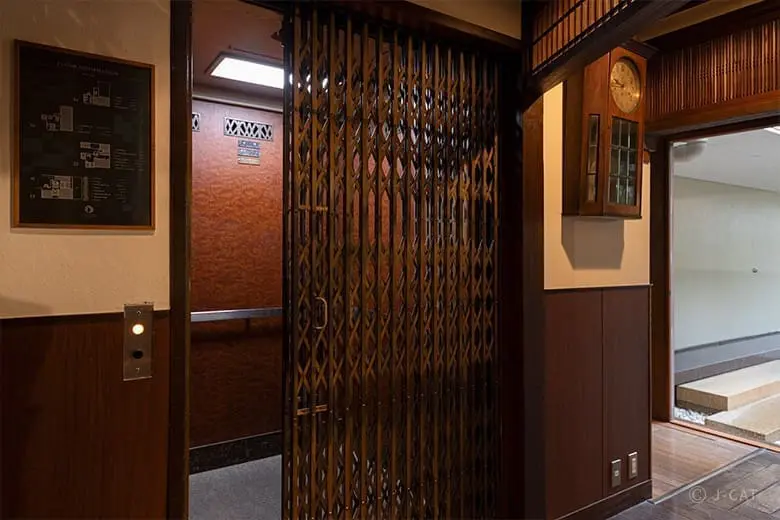 進入旅館內部,首先映入眼簾的是一種融合了日式與西式的裝飾風格,被稱為「五層樓閣建築」。在這裡,您可以欣賞到書院造的天花板裝飾,以及展示東山美景的欄間,這些細節彰顯了昭和時期日本建築的繁複工藝。走到最上層,還能乘坐昭和時期少見的手動蛇腹式電梯,這是由人力手動開關的傳統電梯,現在在現代化建築中已很難見到這種設計了。