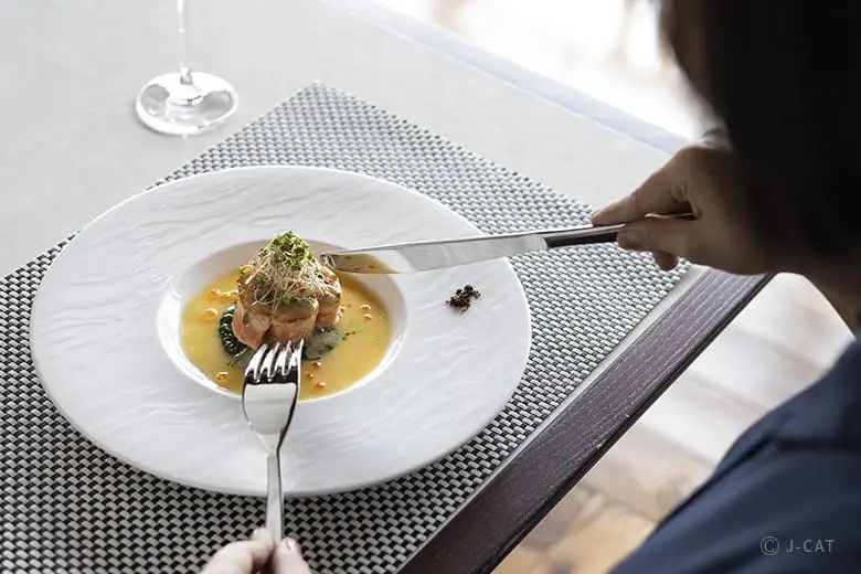 在享受完建築之美後,行程的最後將帶您品味鮒鶴京都鴨川リゾート精心準備的法式午餐。午餐設於舊館一樓的餐廳,這個餐廳設有大窗戶,可以俯瞰鴨川的河畔景致,讓您在舒適的用餐氛圍中,盡情沉浸於京都的自然風光。餐廳的六道菜套餐由擅長法式料理的主廚操刀,以京都當地的新鮮食材製作而成。包括開胃菜、湯品、肉類和魚類主菜,還有精緻的甜點,每道菜都體現了法式料理的精湛技藝和日本食材的和諧搭配。
