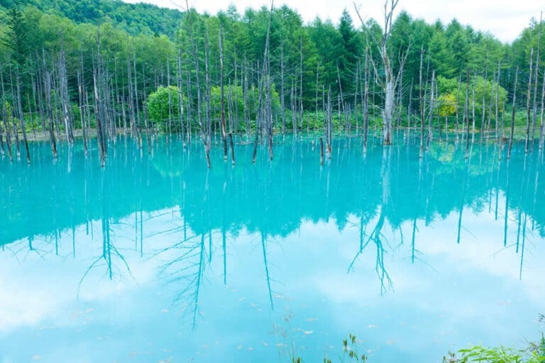因火山礦物而呈現夢幻藍色的天然池水,搭配枯立白樺樹幹,畫面如詩如畫。不同季節與天氣呈現多變藍色,是攝影愛好者必訪的奇景。