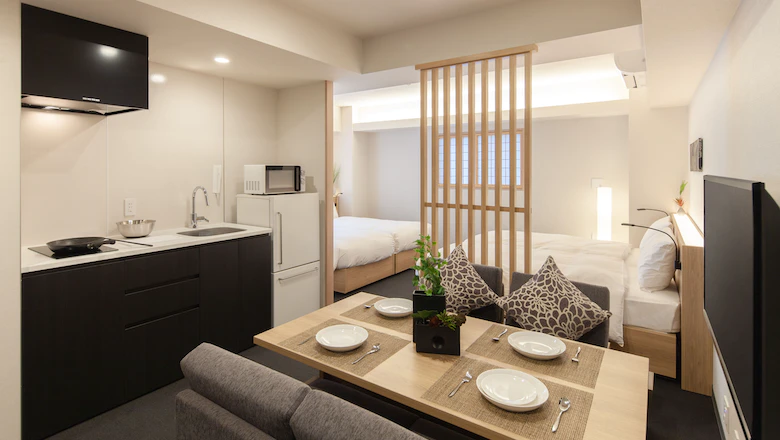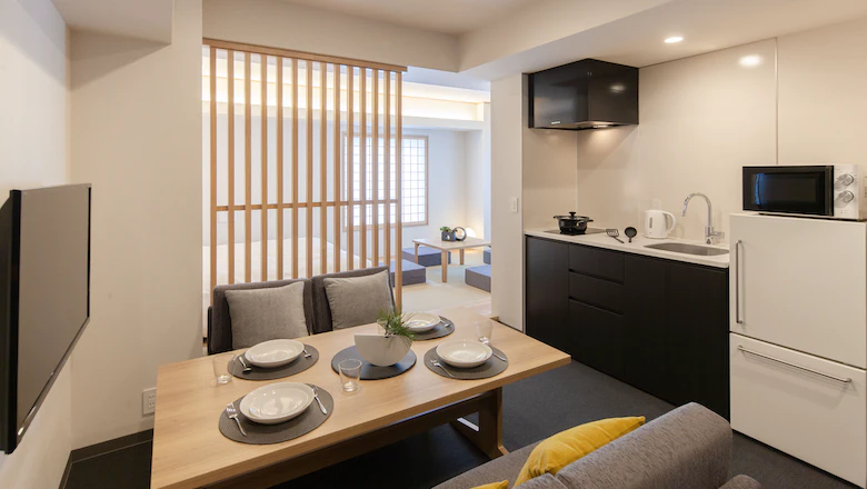 所有房間均配備廚房、廚具與餐桌。讓你在旅途中也宛如置身家中般舒適愜意。乾濕分離設計也是MIMARU的特色之一。客人可在寬敞浴室內盡情泡澡,舒緩疲勞。