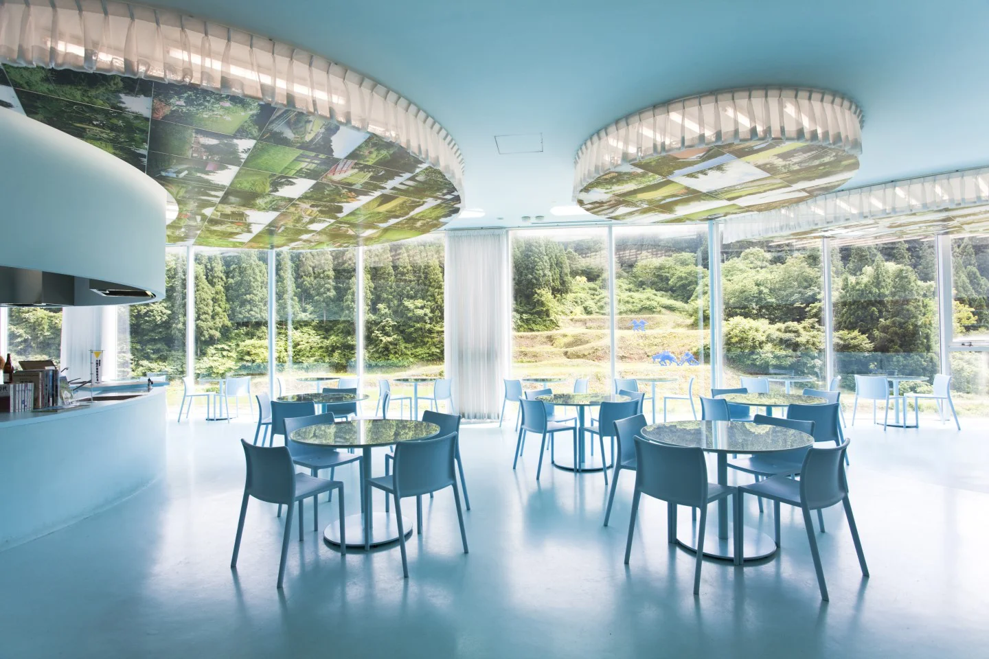 「里山食堂」座落於松代農舞台之中,融合現代建築與自然美景。水藍色玻璃空間與鏡面桌面映照窗外變換的棚田景致,是一座藝術作品般的餐廳 。提供以當地棚田米、妻有豬、農家時令蔬菜為素材的里山自助午餐,約有 20 種左右菜色,能品嚐到傳統與創意兼具的郷土風味 。