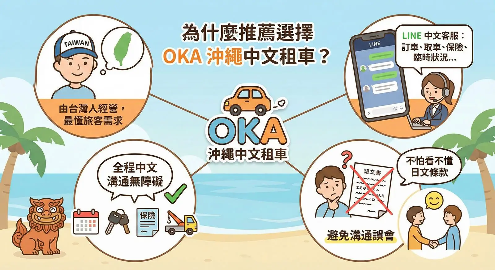 OKA 沖繩中文租車,由台灣人經營,最懂台灣旅客在海外租車的真正需求。提供 LINE 中文客服,全程中文溝通無障礙,不怕看不懂日文條款或溝通誤會。適合第一次沖繩自駕、親子旅遊或長輩同行。讓沖繩自駕變得安心、省時又放心。