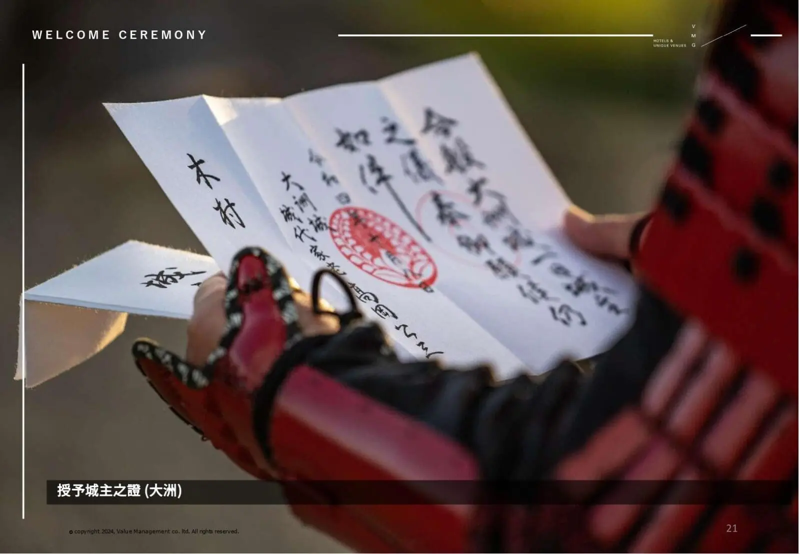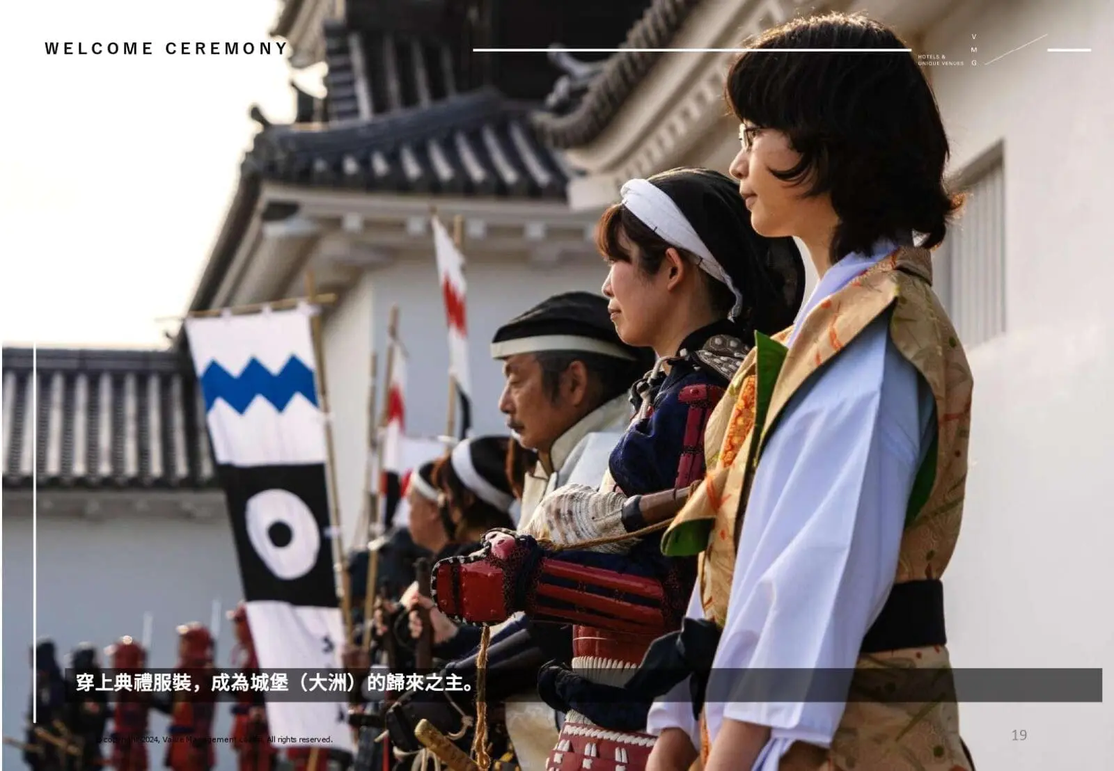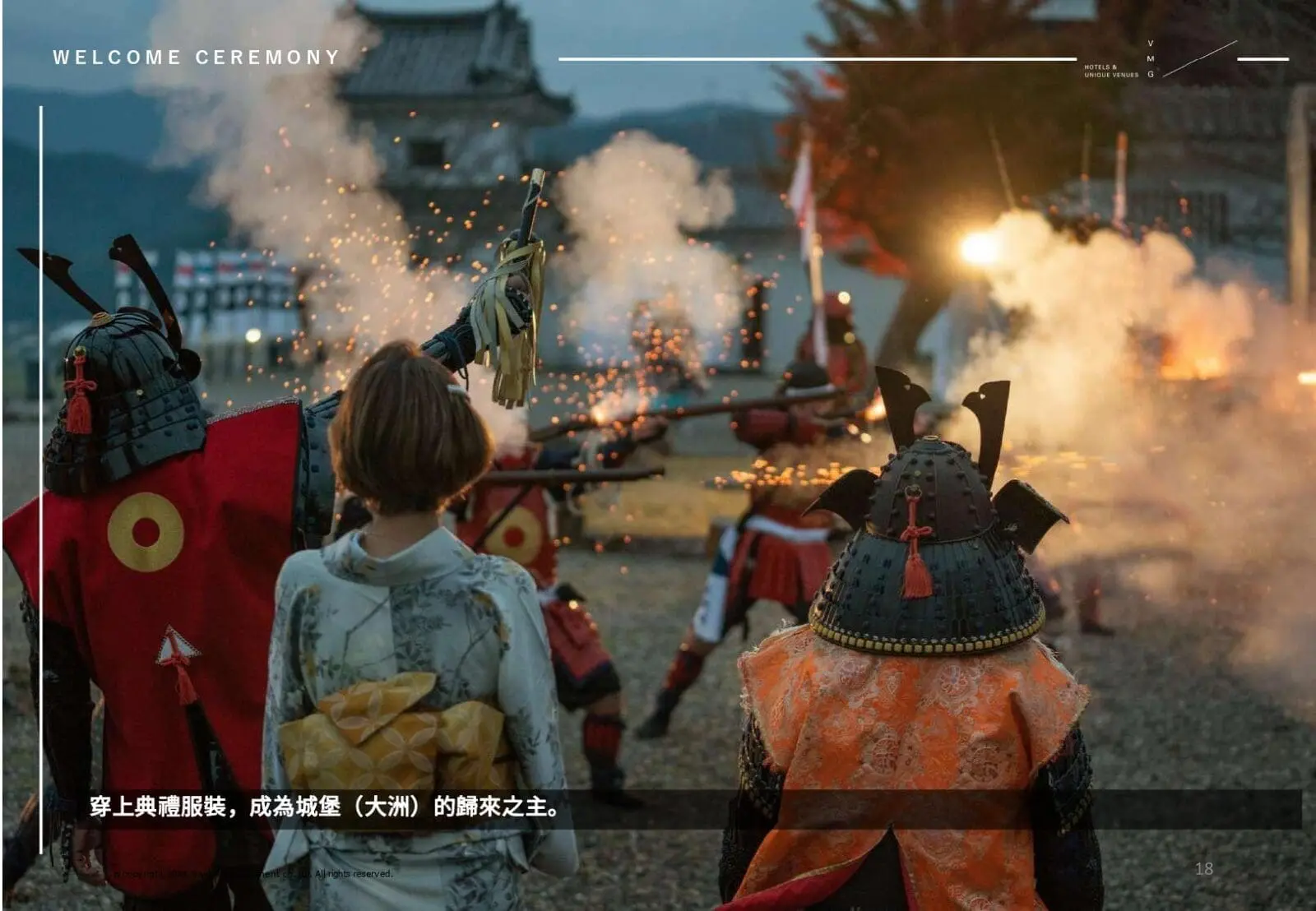 核心理念:「這一晚,你就是城主」——入住復原的古城堡,體驗作為城主的生活,參加專屬活動,如穿戴盔甲、城堡導覽、茶道及禪修