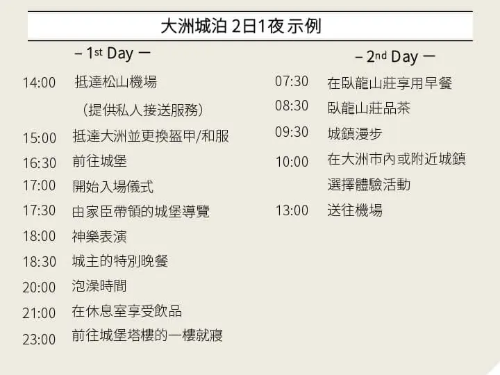 - 抵達與迎接 專屬接送將帶您從松山機場到達大洲城。抵達後,您將換上武士盔甲或和服,正式進入城主角色。