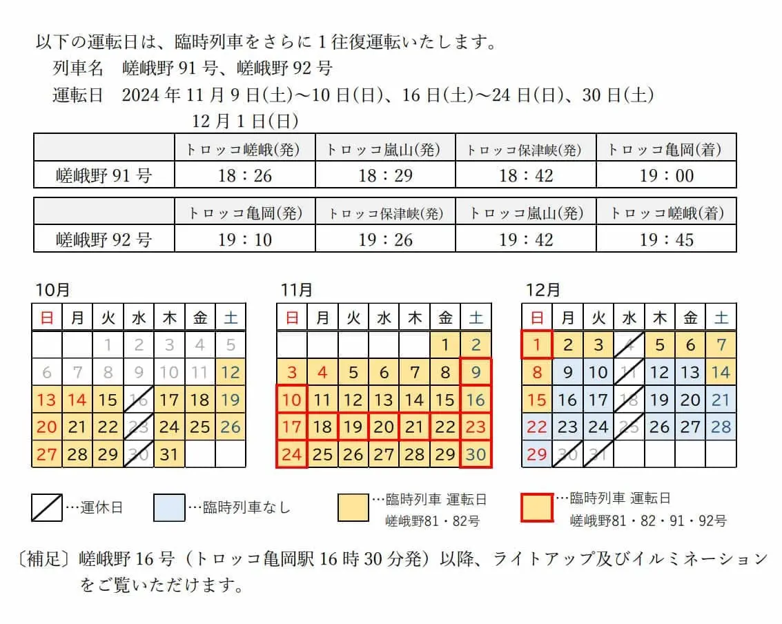 | 11月9日-10日、16日-24日、30日 | 18:26 | 嵯峨野 → 龜岡 | 嵯峨野リッチ91號 |