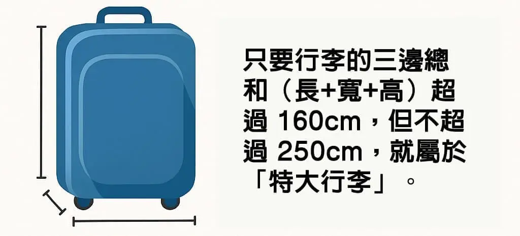只要行李的三邊總和(長+寬+高)超過 160cm,但不超過250cm,就屬於「特大行李」。