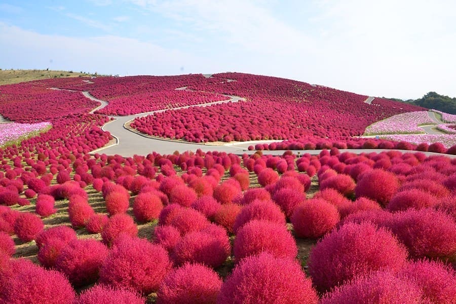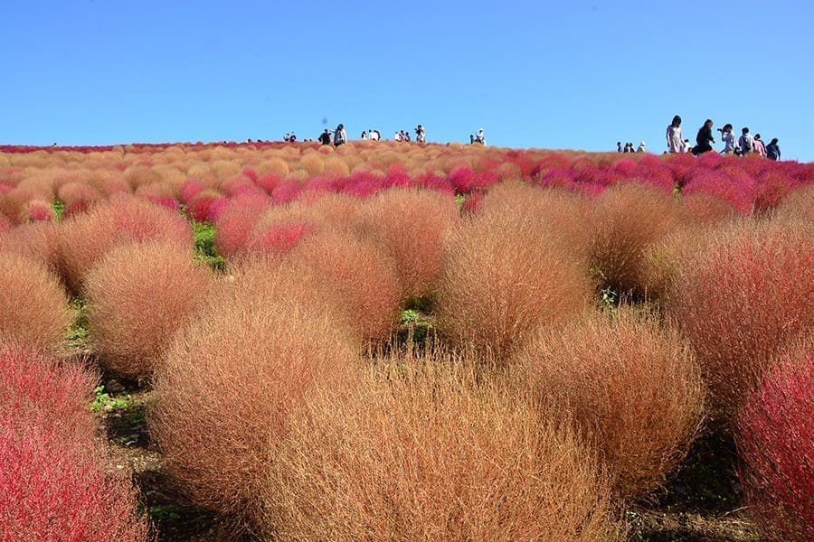 當秋天到來,常陸海濱公園的顏色變得更加溫暖。 10月上旬到下旬,大波斯菊在見晴之丘和其他區域大規模綻放,約有2,000,000棵粉、白、紫相間的花朵搖曳生姿。掃帚草在這個季節達到顏色的巔峰,轉為一片濃烈的紅色,為秋季增添浪漫氛圍。