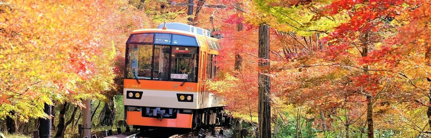 如果您想要體驗一段特別的賞楓旅程,不妨乘坐叡山電車。這條從市原站到二之瀨站的電車路線,被稱為「紅葉隧道」。每年11月上旬到下旬,電車沿途兩側的楓葉變得燦爛無比,仿佛穿越在一條紅葉組成的隧道中。叡山電車的這段路程讓您可以一邊享受舒適的列車旅行,一邊欣賞沿途美麗的紅葉。這是一種輕鬆且充滿詩意的賞楓方式,特別適合那些希望避開人群、享受靜謐秋日的遊客。