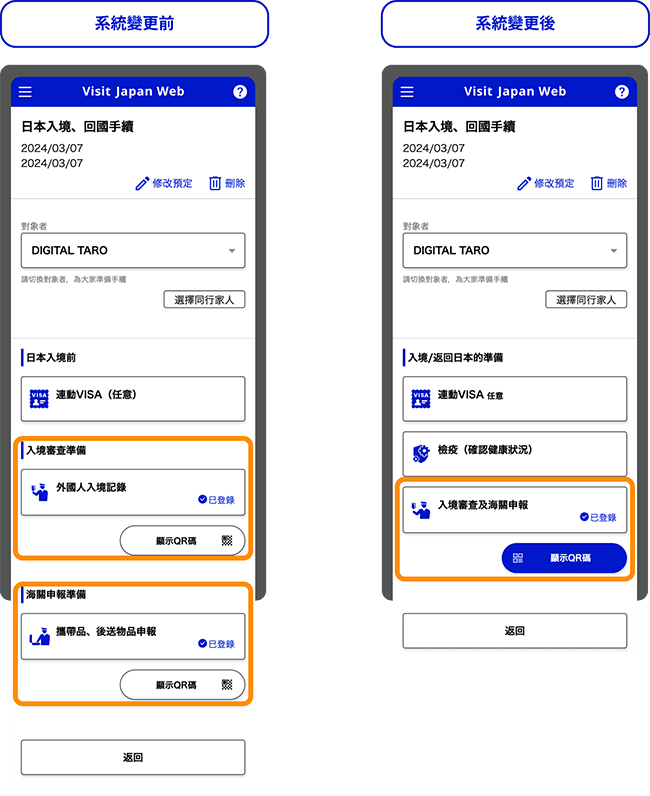 更新後,Visit Japan Web系統將只顯示一個功能表,統一“入境審查以及海關申報”的流程。這意味著,對於計劃於更新後入境或返回日本的旅客來說,無法再使用更新前的二維碼。所有旅客必須在系統更新後登入Visit Japan Web,確認並使用新生成的統一二維碼。