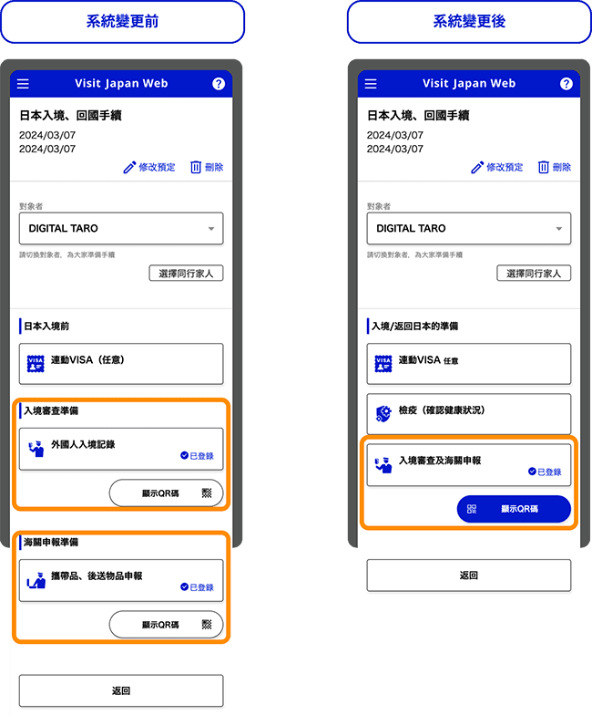 更新後,Visit Japan Web系統將只顯示一個功能表,統一“入境審查以及海關申報”的流程。這意味著,對於計劃於更新後入境或返回日本的旅客來說,無法再使用更新前的二維碼。所有旅客必須在系統更新後登入Visit Japan Web,確認並使用新生成的統一二維碼。
